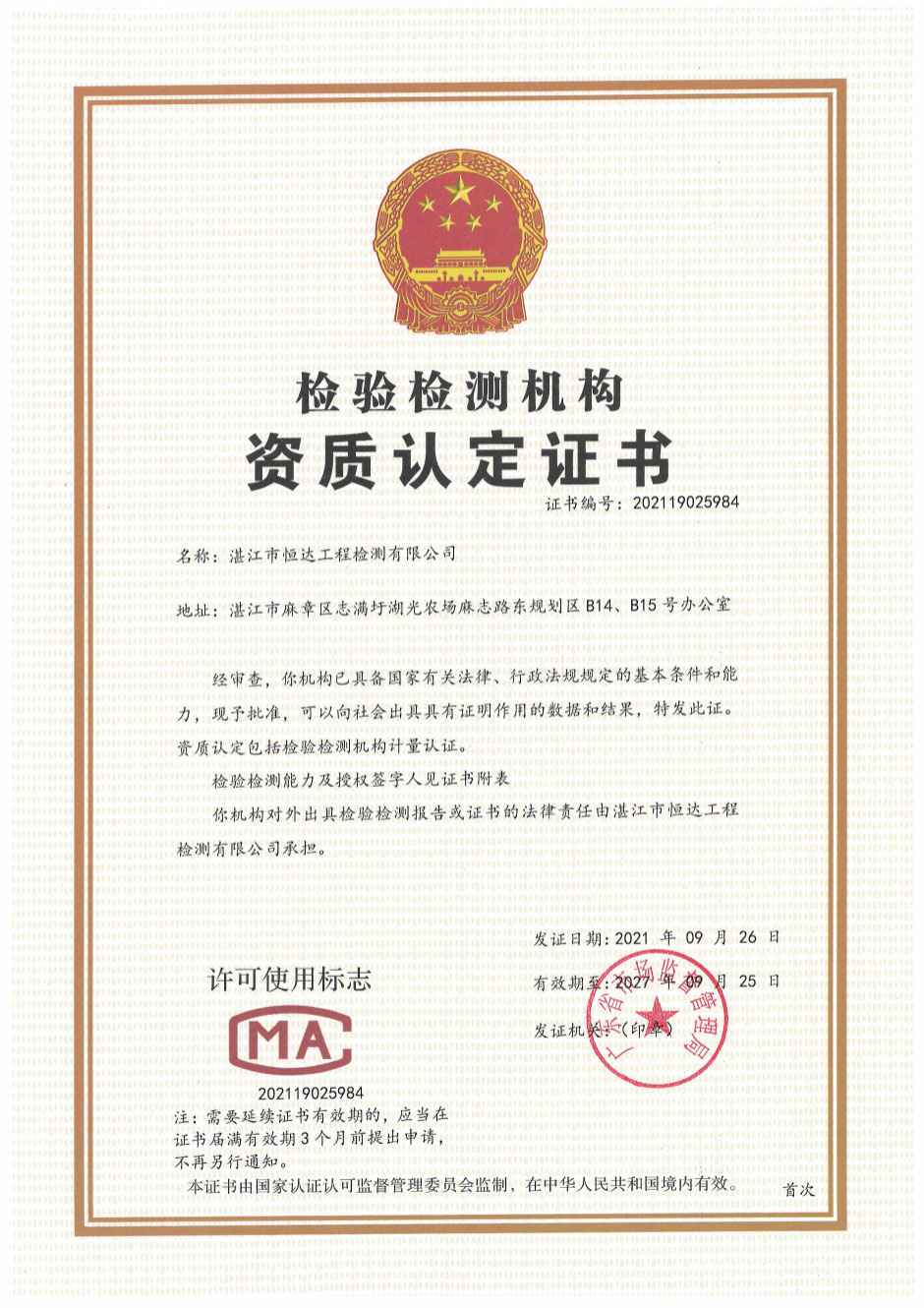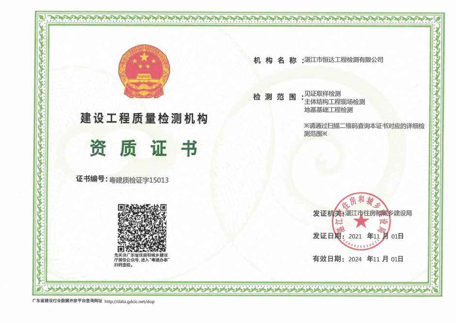 湛江市恒达工程检测有限公司取得以下资质证书: